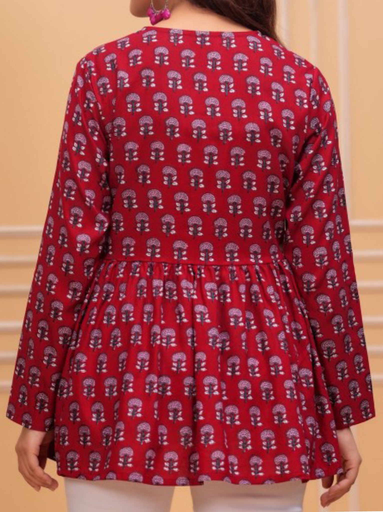 Crafted in a rich crimson red, Lalima features dainty, tree-inspired motifs reminiscent of ancient block printing. The gathered flare below the bust creates a flattering, breezy silhouette that moves with you — combining charm with comfort.